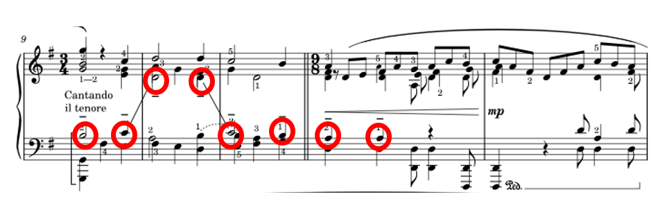 9小節目の1拍目は、これまでの終わりの音であり、これからの始まりの音でもあります。8小節目の終わりから少しゆっくりにして、9小節目の頭の左手ソのオクターブが少し速く入ってから、残りの音を弾くといいでしょう。