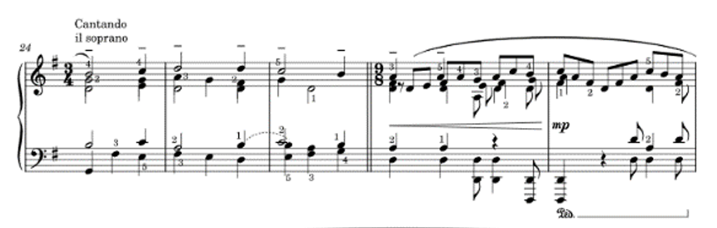 左側のペダルソフトペダルを踏んで、より静かな雰囲気で曲の終わりを表現しましょう。