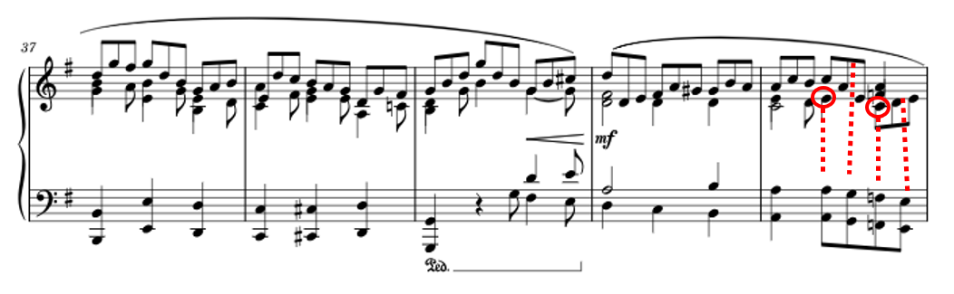 赤線の部分は弾き方としても、表現としても難しい箇所です。