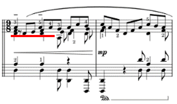 それから、より難しいのは、右手の音を押さえたままの状態で、他の指は伴奏の役割をしなければならない箇所です。