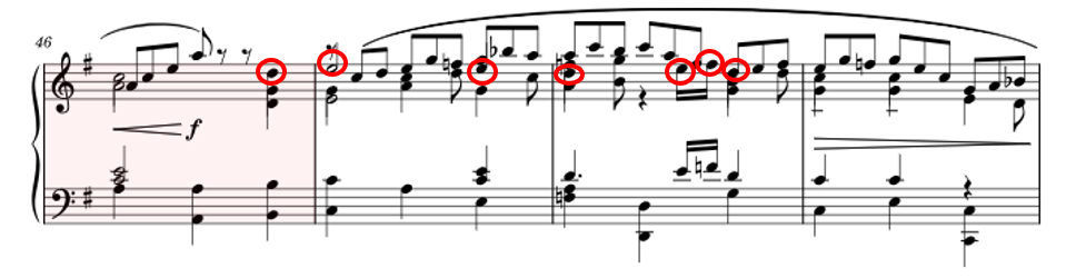 1拍目と2拍目の頭にラのメロディーがあるのですが、何度もラの音が出てくるので大変弾きにくくなっています。また、メロディーではない他の音は極々小さく弾かなければなりません。