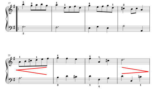 後半17小節目は1番盛り上がる箇所。18小節目、19小節目と音が少しずつ下がっているのを感じて、少し弱くして、21小節目の上がっていくメロディーでクレッシェンドしましょう。