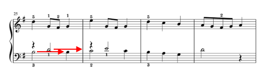 25小節目の左手は、弾きにくいですが2分音符は押さえたまま長さを保ちます。