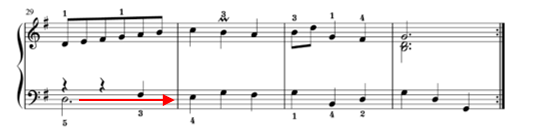 29小節目は、再びクレッシェンド。左手のレの音は3拍伸ばすのを見逃さないようにしましょう。