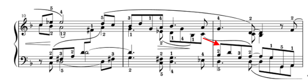23小節目ですが、先程、指が届かないために、右手のファの音はもう離してしまっているので困ったことが起こります。