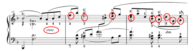 13小節目からからのクレッシェンドで膨らませて。そしてここには、メロディーの他にもう一つ旋律が隠れています。