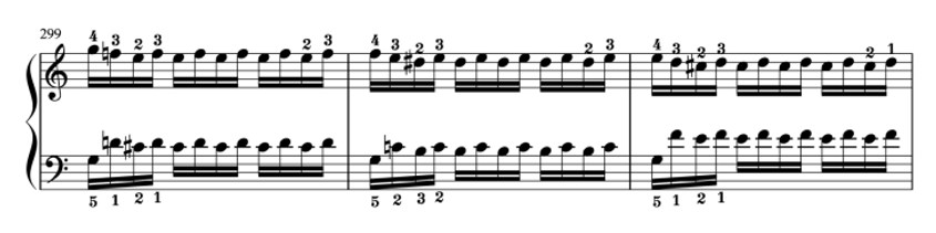 16分音符を安定させて弾くのは難しいことですが、手をクロスさせたり、半音で下がってきたり等、楽しく練習が進むようにも思います。ぜひここで習得して、魅力的な演奏ができるようになりましょう。