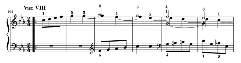 短調に変わります。それを予告するように、バリエーション7が終わった瞬間から雰囲気を変えて、心の準備をしてから8をはじめましょう。